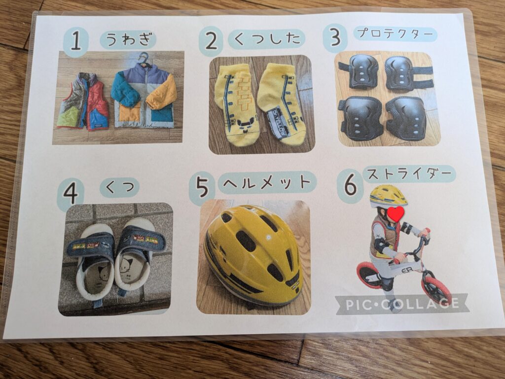 キックバイクに乗るための準備を写真でみて分かるようにしました。